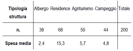 In una località turistica si osserva la seguente distribuzione di 200 turisti secondo le tipologie di strutture ricettive, per ciascuna delle quali è fornito anche l’importo mediamente speso (in centinaia di euro) da ogni turista: