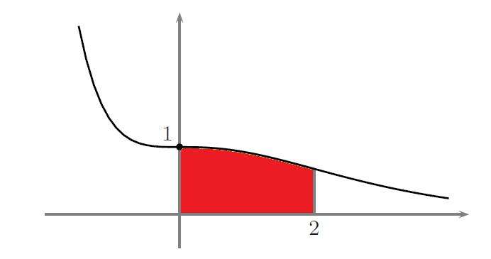 4. L’integrale è espresso in figura qui sopra in rosso, è nella forma: \[ \int_{0}^{2}\left(1+x+\frac{x^{2}}{2}\right)e^{-x}dx \] Risolvo l’integrale per parti, considerando l’esponenziale un fattore finito. \[ \int_{0}^{2}\left(1+x+\frac{x^{2}}{2}\right)e^{-x}dx=-e^{-x}\left(1+x+\frac{x^{2}}{2}\right)+\int_{0}^{2}e^{-x}\left(1+x\right) \] Continuando ad integrare per parti ottengo la risoluzione anche del nuovo integrale:allora \[ \int_{0}^{2}e^{-x}\left(1+x\right)=e^{-x}\left(-3-2x-\frac{x^{2}}{2}\right) \] Quindi l’integrale originale sarà pari a: \[ \int_{0}^{2}\left(1+x+\frac{x^{2}}{2}\right)e^{-x}dx=\left[e^{-x}\left(-3-2x-\frac{x^{2}}{2}\right)\right]_{0}^{2}=e^{-2}\left(-9\right)+3=3-\frac{9}{e^{2}}\approx1,7820 \]