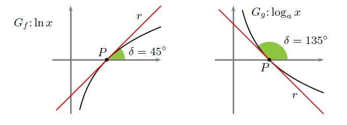 Poichè per il punto di ascissa 1 abbiamo un angolo di 45, poniamo: \[ g’\left(1\right)=\tan\delta\rightarrow\tan45=\frac{1}{1*\ln a}=1\rightarrow\ln a=1\rightarrow a=e \] Invece per un angolo di 135 gradi avremo che: \[ g’\left(1\right)=\tan\delta\rightarrow\tan135=\frac{1}{1*\ln a}=-1\rightarrow\ln a=-1\rightarrow a=\frac{1}{e} \]