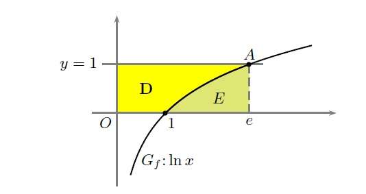 3. Definito il punto A come il punto di Gf avente ordinata pari a 1, l’area della regione finita D si ottiene per differenza tra l’area del rettangolo avente i lati paralleli agli assi coordinati vertici opposti O ed A e l’area del trapezoide E definito da Gf con x compreso tra 1 e l’ascissa del punto A. Pertanto sapendo che l’ordinata del punto A è pari a 1, si ottiene: \[ \ln x=1\rightarrow x_{A}=e\rightarrow A\left(D\right)=x_{A}*y_{A}-\int_{1}^{e}\ln xdx=x_{A}*y_{A}-\left[x\ln x-x\right]_{1}^{e} \] \[ A\left(D\right)=\left(e-e\right)-\left(0-1\right)=1\rightarrow A\left(D\right)=e-1 \]