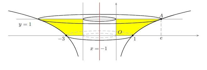 4. Poichè viene chiesto il volume di un solido di rotazione attorno alla retta verticale x = 1 conviene scambiare i ruoli di x e y con la trasformazione seguente: \[ \left\{ \begin{array}{c} x’=y\\ y’=x \end{array}\right. \] Risulta quindi che x’ = ln y’ ossia, esplicitando y’: \[ y’=e^{x’} \] Con tale trasformazione la retta di equazione x = -1 diviene y’ = -1 e l’immagine della regione D diventa la figura qui sotto
