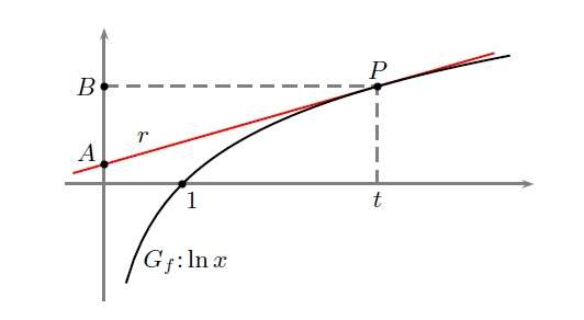 Se P(t, lnt) è un punto qualsiasi di questa funzione, l’equazione della retta tangente in P è: \[ y-\ln t=\frac{1}{t}\left(x-t\right) \] L’ordinata di A, punto di intersezione con l’asse y di r, si ottiene ponendo x = 0 in: \[ y_{A}-\ln t=\frac{1}{t}\left(0-t\right)\rightarrow y_{A}=-1+\ln t \] L’ordinata di B è: \[ y_{B}=y_{P}=\ln t \] E la lunghezza di AB è: \[ AB=|y_{B}-y_{A}|=|\log_{a}t-\left(\log_{a}t-\frac{1}{\ln a}\right)=|\frac{1}{\ln a}|=|\log_{a}e| \] La lunghezza del segmento risulta essere indipendente dalla posizione di P.