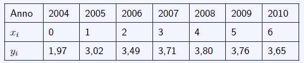 4. Il profitto di un’azienda, in milioni di euro, è stato rappresentato nella tabella sottostante designando con x(i) l’anno di osservazione e con y(i) il corrispondente profitto.