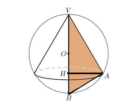 La superficie laterale del cono è (per trovarsi AH si usa il secondo teorema di Euclide, mentre per trovare VA uso il primo teorema di Euclide applicato sullo stesso triangolo): \[ S_{L}=\pi\cdot AH\cdot VA=\pi\cdot\sqrt{VH\cdot HB}\cdot VA=\pi\cdot\sqrt{VH\cdot HB}\cdot\sqrt{VB\cdot VH} \] Espresso nella variabile x diventa: \[ S_{L}=\pi\cdot\sqrt{2r\pi}\cdot\sqrt{x\left(2r-x\right)}=\pi\sqrt{4r^{2}x^{2}-2rx^{3}} \] Per trovare il massimo sfrutto la derivata prima della funzione qui sopra: \[ S_{L}^{‘}\geq0\rightarrow4r^{2}x-3rx^{2}\geq0\rightarrow0\leq x\leq\frac{4}{3}r \] Il valore massimo si avrà quindi per \[ x=\frac{4}{3}r=\frac{4}{3}\cdot10cm=13,3cm \]