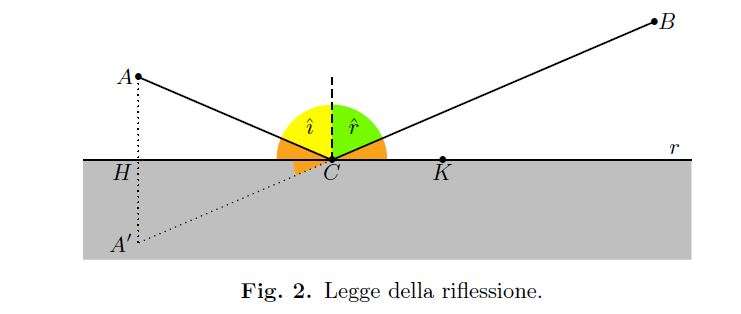 \(Nota\) dalla congruenza \(\triangle AHC' \simeq \triangle A'HC'\;\; \land \;\; \triangle AHC \simeq \triangle A'HC.\) deriva la congruenza degli angoli \(\angle ACH \simeq \angle A'CH \simeq \angle BCK\) . Da quest'ultima discende la relazione \(\hat{i}=\hat{r}\), dove \(\hat{i}\) è l'angolo di incidenza e \(\hat{r}\) quello di riflessione, uguaglianza che costituisce la legge di riflessione dei fenomeni ondulatori (Fig.2).
