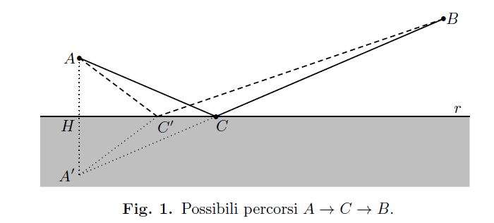 Il quesito può essere risolto tramite osservazioni puramente geometriche: sia \(A’\) il punto simmetrico di \(A\) rispetto alla retta \(r\) e \(C\) il punto di contatto del percorso \(A \to C \to B\) con la retta \(r\) (Fig.1). Si dimostra che il punto \(C\) è determinato dall’intersezione del segmento \(A’B\) e\(r\) e che il percorso \(A \to C \to B\) è il più breve. Supponiamo per assurdo che \(C\) non sia il punto che definisce il percorso più breve.Esiste quindi un altro punto \(C’\in r\) tale che