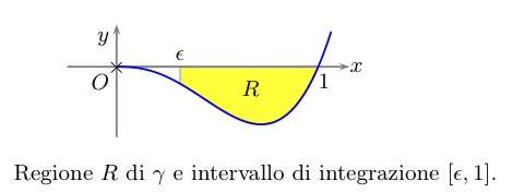 La regione R delimitata da \(\gamma\) (vedi figura sotto) e dall’asse \(x\) è continua nell’ intervallo chiuso \( [epsilon,1] \)