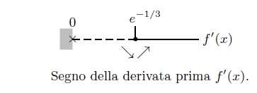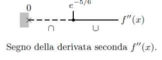 dimostra l’esistenza di un minimo per la funzione \(f\) in corrispondenza di \( x_m = e^{−1/3}\). La derivata seconda è invece: \[f’’(x) = x(6 \ln x +5)\] e il suo segno dipende dal solo secondo fattore in quanto \(x > 0\). Pertanto : \[f’’ (x) \leq 0 \longrightarrow 6 \ln x +5 \leq 0 \longrightarrow x \leq e^{-\frac{5}{6}}\]. Dalla rappresentazione grafica del segno della derivata seconda presente nella seguente figura