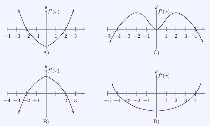 Esclusi i casi C) e D) dove la derivata prima non si annulla in \(x = \pm 2, f'(\pm 2) \neq 0\),