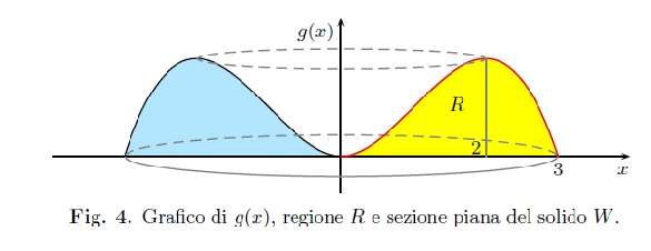 4) La regione R rappresentata in giallo nella fig. 4 genera in una rotazione completa attorno all’ asse y il solido W la cui sezione nel piano xy è la regione in colore nella medesima figura.
