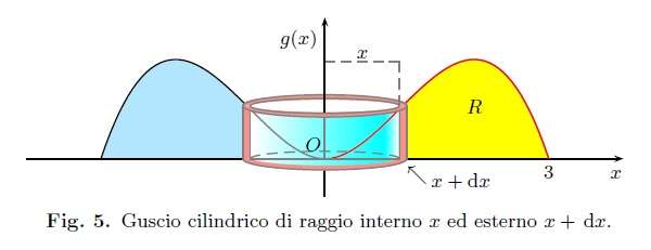 Per giustificare la formula proposta per il calcolo del volume W consideriamo i punti di ascissa \(x\in[0,3]\) e \(x + \mbox{d}x\), quest’ ultimo ottenuto sommando ad x il suo differenziale. Entrambi i valori si possono interpretare come i raggi di due cilindri (fig. 5), disposti uno interno all’ altro, aventi per asse comune l’ asse y e come altezza il valore della funzione in un qualsiasi punto compreso nell’ intervallo \([x, x+\mbox{d}x]\).