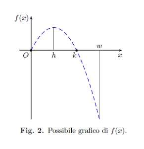 Seppure in modo qualitativo osserviamo che il coefficiente angolare della retta tangente a \(\Gamma\) in \([0, k]\) (cioè \textit{g'(x})) assume all'aumentare di \textit{x} in \([0, h]\) valori sempre maggiori, mentre successivamente in \([h, k]\) i suoi valori decrescono gradualmente fino ad annullarsi in \(x = k\) per poi in \([k, w]\), ulteriormente diminuire fino a \(x = w\).