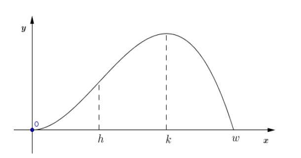 Nella figura a lato è disegnato il grafico \(\Gamma\) di \(g(x) = \int_{0}^{x}f(t)\,dt\) con f funzione definita sull’ intervallo \([0, w]\) e ivi continua e derivabile. \(\Gamma\) è tangente all’ asse x nell’origine O del sistema di riferimento e presenta un flesso e un massimo rispettivamente per x=h e x=k.
