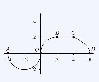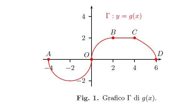 Sia \(g(x)\) una funzione continua sull’intervallo chiuso [-4,6]. Il grafico di \(g(x)\) mostrato in Fig., passa per i punti \(A(-4;0),\;O(0;0),\;B(2;2),\;C(4;2),\;D(6;0)\) e consiste della semicirconferenza di diametro \(AO\), dell’arco, quarto di circonferenza, di estremi \(O\) e \(B\), del segmento \(BC\) e dell’arco \(CD\) di una parabola avente per asse di simmetria l’asse \(x\).\\