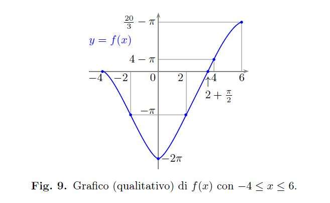 4. Riassumiamo tutti i risultati ottenuti in Fig. 8. Dalla Fig.9 invece notiamo che la funzione presenta un minimo assoluto in \(x=0\) dove \(f(0)=-2\pi\), mentre il massimo assoluto è raggiunto a \(x=6\) dove \(f(6)=\frac{20}{3}-\pi\).