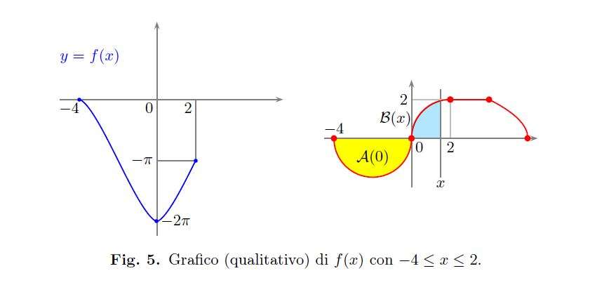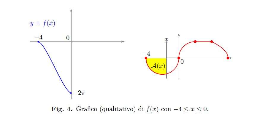 Nell’intervallo [0,4] per \(\alpha\) crescente l’area diminuisce poichè \(g(x)\leq 0\) fino a raggiungere il valore \(f(0)=-2\pi\). Il suo grafico, in questo intervallo, è rappresentato in Fig.4.\\