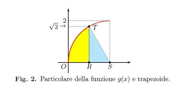 L’integrale \(\int_{0}^{1}g(t)dt\) esprime l’area in giallo nella Fig.2. Ricordiamo che l’area di un settore circolare che insiste su un angolo al centro \(\alpha\) radianti è \(\mathcal{A}=\frac{1}{2}\alpha r^2\) dove in questo caso \(\alpha=\frac{\pi}{3}\) dato che \(\cos(\angle RST=\angle OST)=\overline{RS}/\overline{ST}=1/2\). Perciò