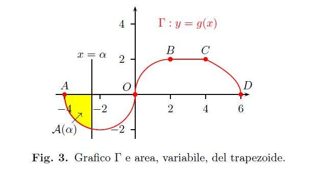 3. Per ottenere l’andamento di \(f(x)\) vediamo come varia l’area della figura compresa tra \(\Gamma\) e \(x=\alpha\) con \(-4\leq\alpha\leq6\) (Fig.3).