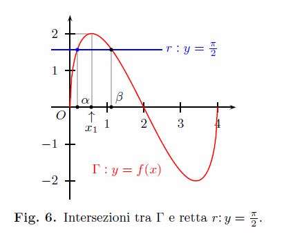 I punti con ascissa unitaria sono tali da soddisfare l’equazione \(h(x)=1\) che implica che \((2-x)\sqrt{4x-x^2}=\frac{\pi}{2}+2k\pi\) con \(k\in\mathbb{Z}\), che evidentemente si riduce alla sola \((2-x)\sqrt{4x-x^2}=\frac{\pi}{2}\). Quest’ultima identità si traduce nella ricerca dei punti di intersezione tra il grafico \(\Gamma\) e la retta \(y=\pi/2\), ovvero come mostrato in Fig. 6, delle coordinate \(\alpha\in]0,x_1]\) e \(\beta\in]x_1,2[\) dove \(x_1\) è la coordinata del punto di massimo raggiunto nel grafico \(\Gamma\).