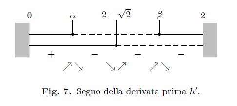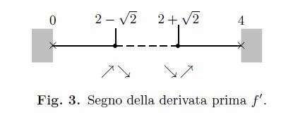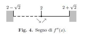 \(f”(x)\geq 0\) per \(2-\sqrt{6}\leq x \leq 2+\sqrt{6}\) e \(x\geq 2\) . Quindi nel nostro intervallo di interesse \([2-\sqrt{2},2+\sqrt{2}]\) (Fig.4) si ha che \(f'(x)\) assume il valore minimo per \(x=2\) dove risulta \(f'(2)=-2\). Quindi l’equazione