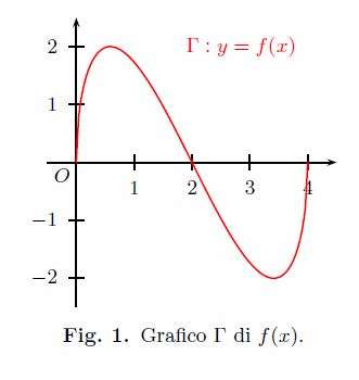 1. Per dimostrare che il grafico \(\Gamma\) (Fig.1) della funzione \(f:[0,4]\to[-2,2]\) è simmetrico rispetto al punto \((2,0)\) richiamiamo le equazioni di simmetria rispetto al punto \((a,b)\)