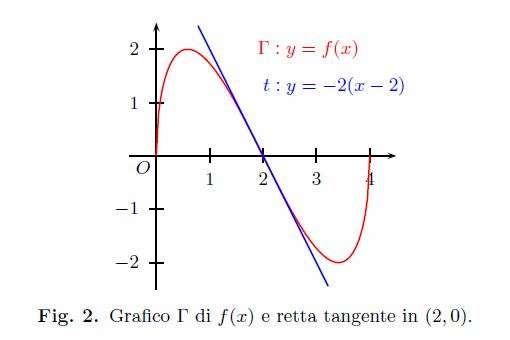 Con la condizione che \(0 < x < 4\): posto \(\tan\alpha=f'(2)\) discende che \(\tan\alpha=-2\) e quindi \(\alpha=\arctan(-2)\approx-63,4348^\circ=-63^\circ26'06''\).\\ L'equazione della tangente è \(t:y=-2(x-2)(Fig.2)\).\\