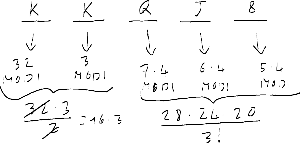 La terza carta puo’ essere scelta tra i 7 valori rimasti e quindi in 7*4=28 modi; la quarta carta in 6*4=24 modi e la quinta in 5*4=20 modi. Poiche’ l’ordine non e’ importante, il numero totale di modi con cui posso scegliere le ultime 3 carte e’ 28*24*20/3!=2240.