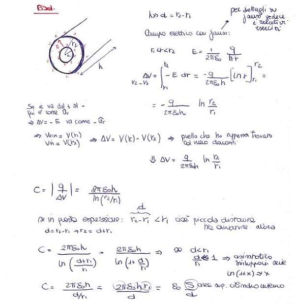 Due cilindri di materiale conduttore sono posti coassialmente tra di loro. Il cilindro più interno ha raggio R1 e quello più esterno R2. Entrambi sono lunghi h, con h molto più grande di R2. Il cilindro di raggio R1 possiede una carica q positiva. Quanto vale la differenza di potenziale tra le armature del condensatore cilindrico? E la sua capacità?