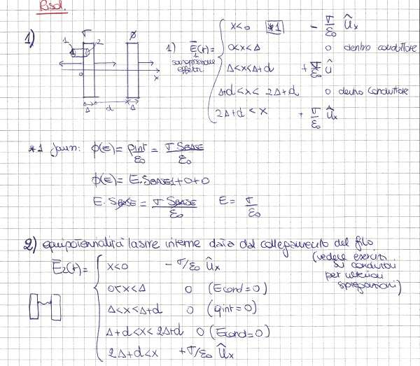 Due piastre conduttrici sono affacciate ad una distanza d. La loro superficie è A e il loro spessore è Δ. Costituiscono quindi un condensatore a facce piane parallele. Una delle due lastre è carica con una carica Q positiva. L’altra è scarica. Calcolare il campo elettrico in tutto lo spazio.