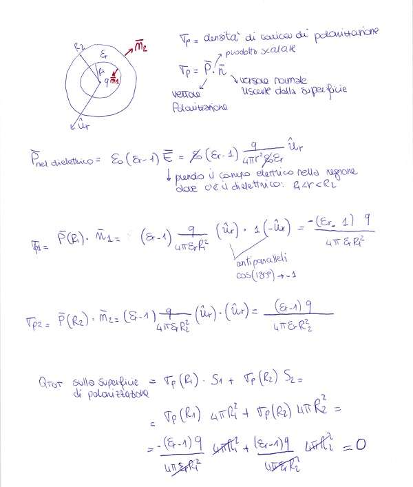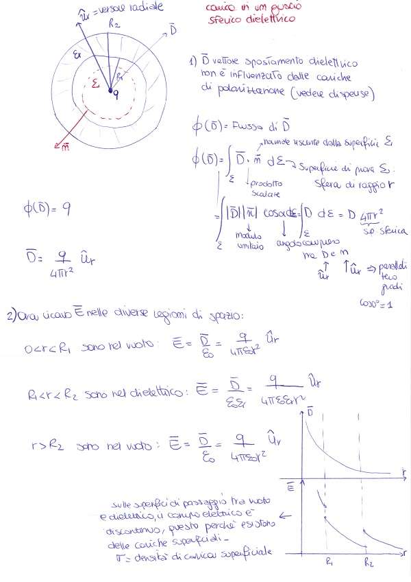 Una carica puntiforme carica positivamente è posta al centro di un guscio sferico di materiale dielettrico (costante dielettrica relativa εr, raggio interno R1, raggio esterno R2). Calcolare il vettore spostamento dielettrico D e il campo elettrico E in tutto lo spazio. Calcolare inoltre le densità di carica di polarizzazione sulle due superfici sferiche.
