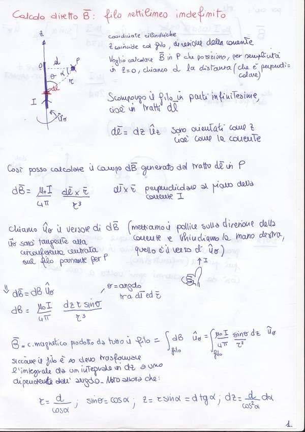 Un filo rettilineo di materiale conduttore e di sezione trascurabile è percorso da una certa corrente stazionaria I. Calcolare il campo magnetico B in un punto P dello spazio utilizzando il metodo diretto.