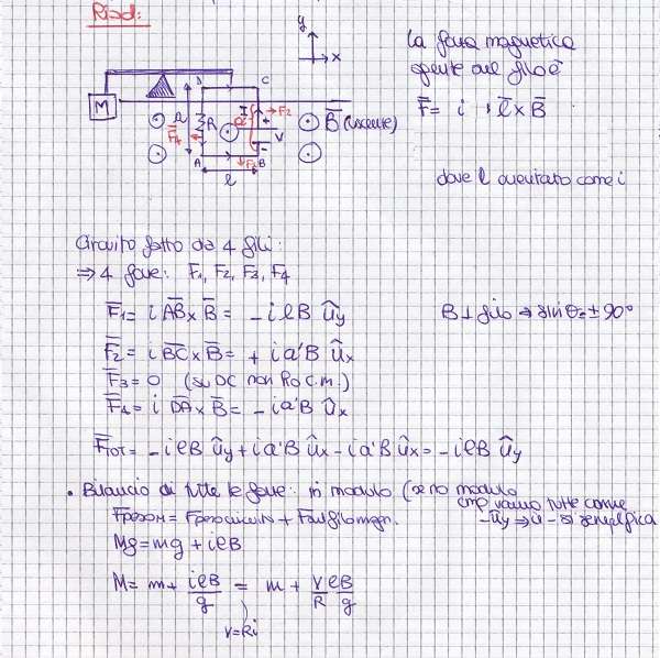 Un circuito rettangolare ha lati l ed a. Al suo interno ha una resistenza R ed un generatore di differenza di potenziale, come in figura. È parzialmente immerso in una regione di spazio dove è presente un campo di induzione magnetica pari a B, perpendicolare al piano del circuito. Come si vede in figura è collegato ad una bilancia che ha sull’altro braccio una massa M. Calcolare il valore di tale massa per avere una situazione di equilibrio.