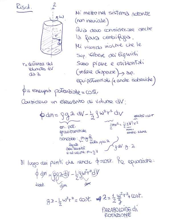 Fluidostatica – Esercizio 3 Un contenitore, di forma cilindrica, viene riempito da un liquido con densità ρL. Ad un certo istante viene messo in rotazione, attorno al suo asse verticale z, con una certa velocità angolare ω. Che forma assume la superficie libera del liquido?
