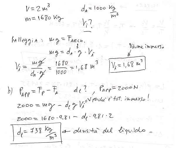 Forza di Archimede – Esercizio 3 Un corpo avente il volume di 2 m3 ed una massa di 1680 Kg è immerso in acqua. a) Calcolare il volume immerso del corpo. b) Calcolare la densità di un liquido nel quale il corpo totalmente immerso assume il peso apparente di 2000 N.