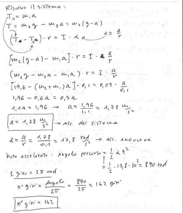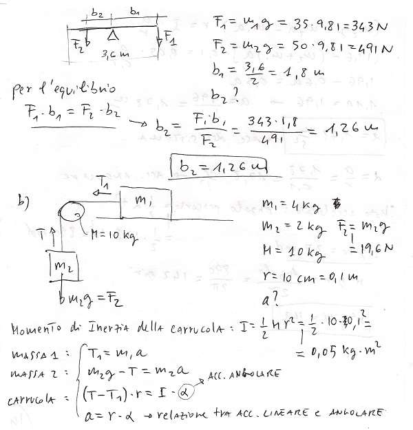 a) Un dondolo è costituito da una tavola uniforme di lunghezza 3.6 m appoggiata su un supporto (fulcro) posto al centro. Se un bambino avente la massa di 35 Kg siede ad una delle estremità della tavola calcolare a quale distanza dal fulcro deve sedere un altro bam- bino avente la massa di 50 Kg per bilanciare il dondolo. b)Due masse m1= 4kg e m2=2kg, sono collegate da un filo inestensibile e privo di massa che aderisce ad una carrucola, schematizzabile come un disco, avente la massa M = 10 Kg ed il raggio di 10 cm, ruotante attorno al proprio asse. La prima massa si muove su un piano orizzontale senza attrito mentre la seconda è sospesa e si muove lungo la direzione verticale. a) Si determini l’accelerazione del sistema. c) Calcolare quanti giri compie il disco in 10 s se al tempo t0=0 la velocità angolare iniziale è nulla.