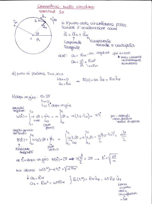 Cinematica – Esercizio 10 Un punto materiale si sta muovendo su una circonferenza di raggio R con accelerazione angolare α costante. Calcolare il vettore accelerazione quando:a) il punto parte da fermob) il punto compie il primo giro.