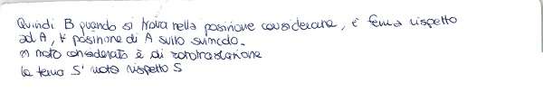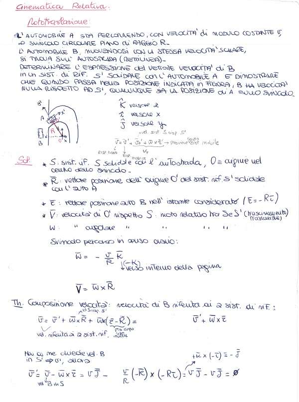 Un’automobile A sta percorrendo, con velocità di modulo costante v, lo svincolo circolare piano di raggio R per uscire da un tratto autostradale. Una seconda automobile B, muovendosi con la stessa velocità scalare, si trova ancora sul tratto autostradale rettilineo, appena prima dello svincolo. Determinare l’espressione del vettore velocità della macchina B in un sistema di riferimento solidale con l’automobile A e dimostrare che quando passa nella posizione di A, l’automobile B ha una velocità nulla rispetto al sistema di riferimento solidale con A, qualunque sia la posizione di A sullo svincolo.