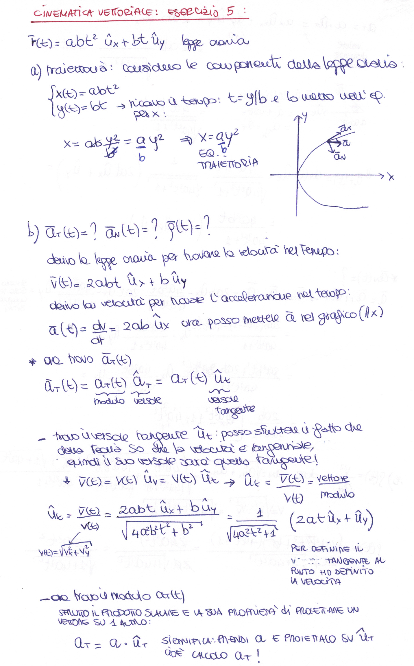 Un punto materiale si sta muovendo nel piano (x,y) secondo la seguente legge oraria: \[ \mathbf{\bar{r}}\left(t\right)=abt^{2}\boldsymbol{\hat{u_{x}}}+bt\boldsymbol{\hat{u_{y}}} \] a) Ricavare l’equazione della traiettoria del punto nel piano cartesiano.