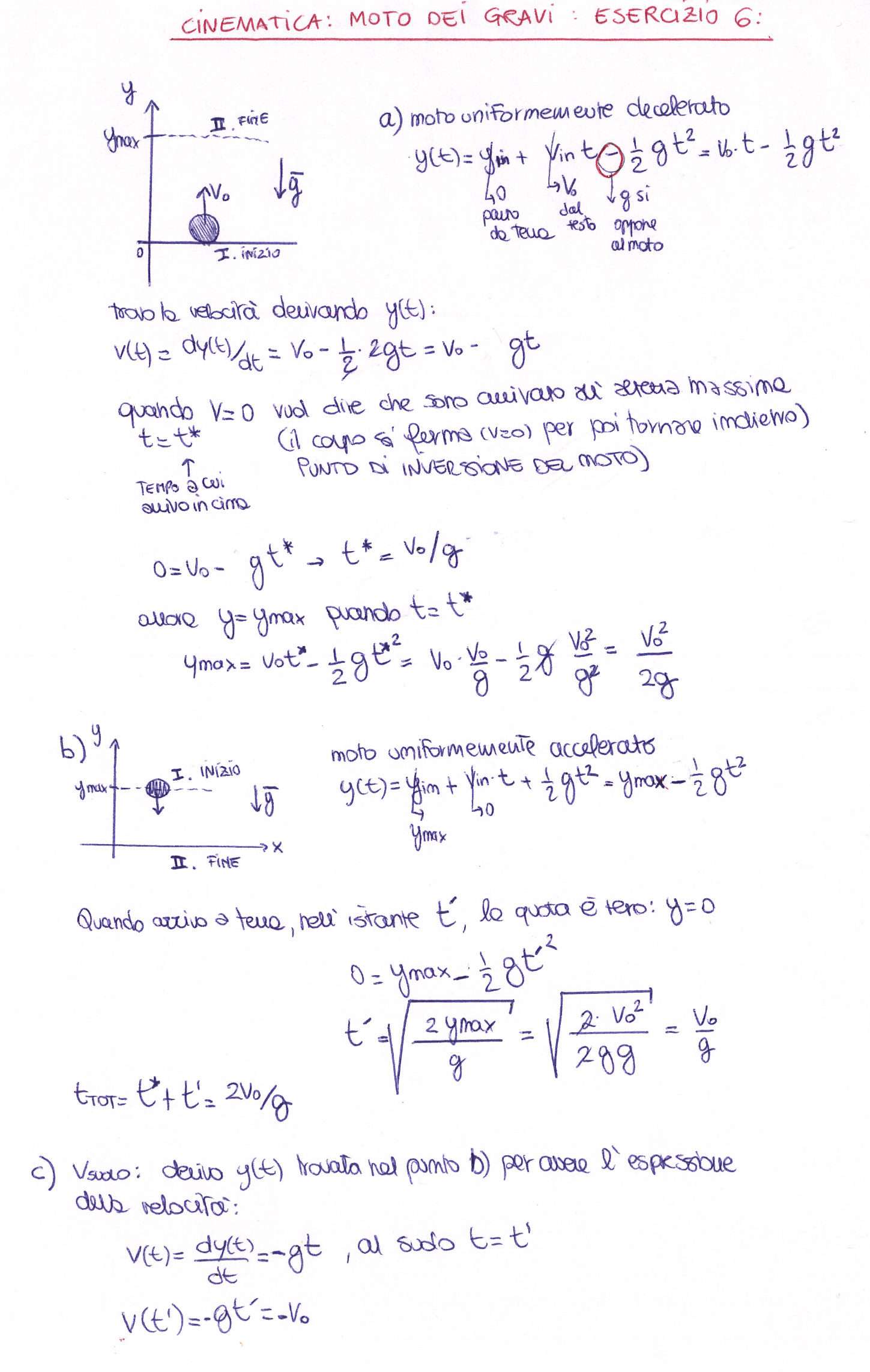 In questo modo abbiamo trovato la velocità pari a v(t)=-gt. Dovendo poi capire la velocità del corpo a terra, quindi quella per t=t’ abbiamo sostituito a t il valore di t’= v0/g ottenendo velocità uguale in modulo ma contraria in verso a v0.
