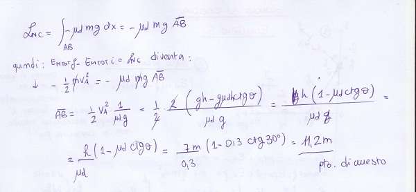 Un corpo è fermo ad un’altezza h = 7 m di un piano inclinato di 30° rispetto all’orizzontale. Ad un certo punto incomincia a rotolare senza strisciare sul piano inclinato. Il piano è scabro e il coefficiente di attrito dinamico vale µd = 0,3. Dopo il piano inclinato raggiunge un piano orizzontale, anch’esso scabro con lo stesso coefficiente d’attrito. In che posizione sul piano orizzontale si ferma?