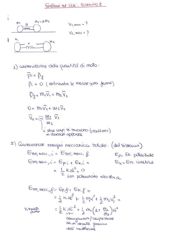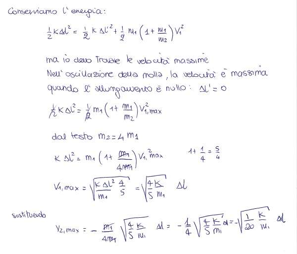 Una molla di costante elastica k, tiene legati due corpi di massa m1 e m2 = 4m1. I due corpi sono appoggiati su di un piano liscio. La molla è inizialmente compressa di un tratto Δl con un filo. Ad un certo punto il filo viene tagliato e i due corpi sono quindi liberi di oscillare. Calcolare le velocità massime raggiunte dai due corpi.