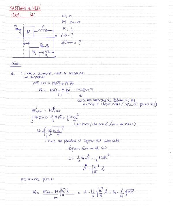 Una pallottola di massa m e velocità iniziale Vo, attraversa un blocco di legno di massa M. Il blocco è inizialmente in quiete sul piano orizzontale liscio ed è connesso ad una molla di costante elastica k. Se il blocco dopo l’urto si muove di un tratto L,