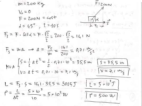 Su un corpo di massa pari a 200 kg, inizialmente fermo, viene applicata una forza costante di 200N, che forma un angolo di 45 ° con lo spostamento. a)Si determini lo spostamento subito dal corpo in 10s e la velocità raggiunta. b) Si calcoli, inoltre, il lavoro della forza e la potenza sviluppata.