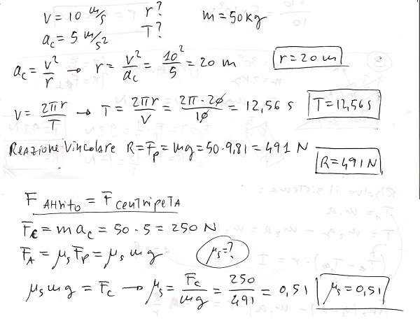 Un punto materiale si muove su di una circonferenza di moto circolare uniforme con una velocità di 10 m/s ed un’accelerazione centripeta di 5m/s2 . Calcolare il raggio della circonferenza ed il periodo del punto materiale. b) Calcolare il coefficiente di attrito statico e la reazione vincolare del piano orizzontale su cui si muove il punto materiale assumendo che il punto materiale abbia la massa di 50Kg.