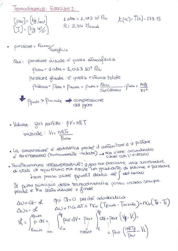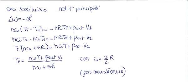 Un gas perfetto (n moli, biatomico, alla temperatura T1) è contenuto in un cilindro (base circolare raggio r, pareti adiatermane) chiuso da un pistone (massa trascurabile, adiatermano). Il sistema è in equilibrio. Ad un certo istante viene aggiunta, sopra al pistone, una massa m. Il sistema raggiunge quindi un nuovo equilibrio, calcolarne la temperatura finale.