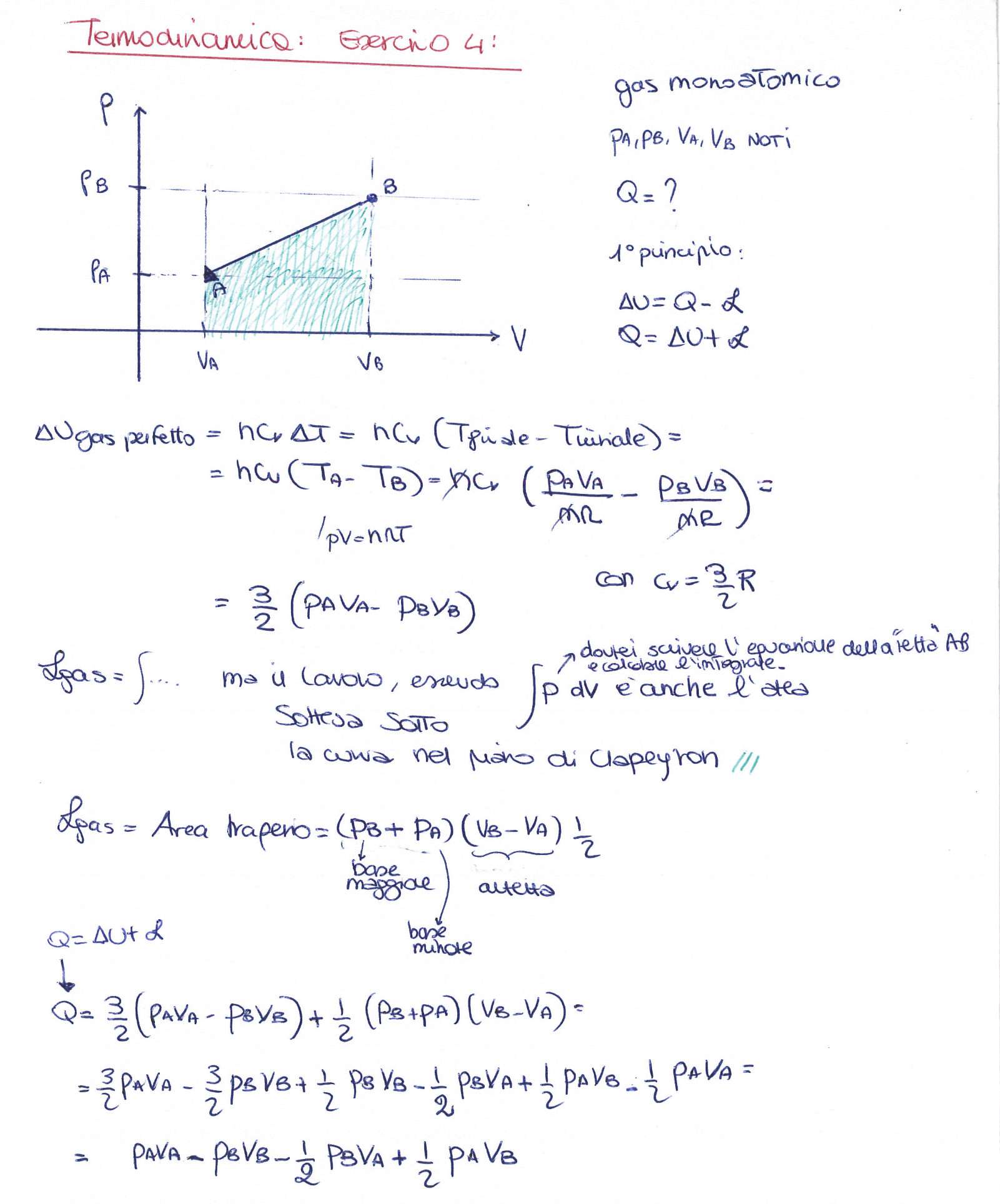 Un gas perfetto monoatomico compie una trasformazione reversibile come mostrato nella figura. Supponendo di conoscere pA, pB, VA e VB, calcolare il calore scambiato dal gas durante la trasformazione.