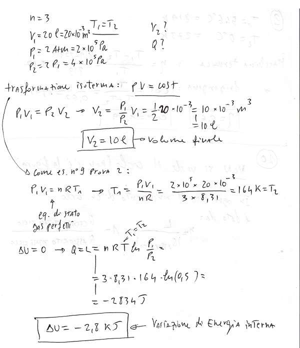 Tre moli di gas perfetto occupano il volume di 20 l alla pressione di 2 atm. Sapendo che il gas raddoppia la sua pressione isotermicamente, calcolare il volume finale ed il calore scambiato durante la trasformazione.