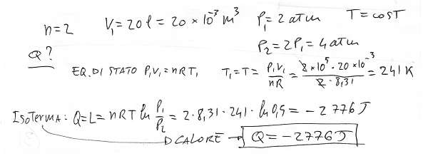 Termodinamica – Esercizio 6 Due moli di gas perfetto occupano il volume di 20 l alla pressione di 2 atm. Sapendo che il gas raddoppia la sua pressione isotermicamente, calcolare il calore scambiato durante la trasformazione.