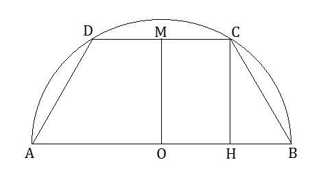 Vista la figura, chiamiamo: \[ \overline{OC}=\overline{OB}=r\rightarrow\overline{AB}=2r \] \[ \overline{OM}=\overline{CH}=h \] \[ \overline{DC}=b\rightarrow\overline{MC}=\overline{OH}=\frac{b}{2} \] La superficie del trapezio è \[ A=\frac{\left(\overline{AB}+\overline{DC}\right)\cdot\overline{CH}}{2} \] \[ A=\frac{h\left(2r+b\right)}{2} \] Considerando il triangolo rettangolo OCH possiamo trovare h in funzione di b, grazie al teorema di Pitagora: \[ h=\sqrt{r^{2}-\left(\frac{b}{2}\right)^{2}}\rightarrow h=\sqrt{r^{2}-\frac{b^{2}}{4}} \] Ora possiamo scrivere l’area in funzione di una sola variabile (b): \[ A\left(b\right)=\frac{1}{2}\sqrt{r^{2}-\frac{b^{2}}{4}}\cdot\left(2r+b\right) \] \[ A\left(b\right)=\frac{1}{4}\sqrt{4r^{2}-b^{2}}\cdot\left(2r+b\right) \] Calcoliamo la derivata: \[ \frac{dA}{db}=\frac{1}{4}\left[\frac{-2b\left(2r+b\right)}{2\sqrt{4r^{2}-b^{2}}}+\sqrt{4r^{2}-b^{2}}\right] \] \[ \frac{dA}{db}=\frac{-2rb-b^{2}+4r^{2}-b^{2}}{4\sqrt{4r^{2}-b^{2}}} \] \[ \frac{dA}{db}=\frac{-2b^{2}-2rb+4r^{2}}{4\sqrt{4r^{2}-b^{2}}} \] Studiamone il segno: \[ \frac{dA}{db}\geq0\rightarrow-2b^{2}-2rb+4r^{2}\geq0 \] perchè il denominatore è positivo. \[ \frac{dA}{db}\geq0\rightarrow b^{2}+rb-2r^{2}\leq0 \] Facendo i conti, e ricordandoci che b non può essere negativo, otteniamo: \[ \frac{dA}{db}\geq0\rightarrow b\leq r \] Abbiamo trovato l’intervallo di b per il quale la derivata della funzione A è positiva. La funzione A(b) è crescente per b minore di r, decrescente per b maggiore di r, ha quindi un massimo per \[ b=r \] Quindi risulta \[ \overline{DC}=r \] \[ \overline{MC}=\overline{OH}=\overline{HB}=\frac{r}{2} \] I triangoli OHC e CHB sono quindi congruenti, in particolare \[ \overline{CB}=\overline{AD}=r=\overline{DC} \] e il trapezio è un semiesagono regolare.