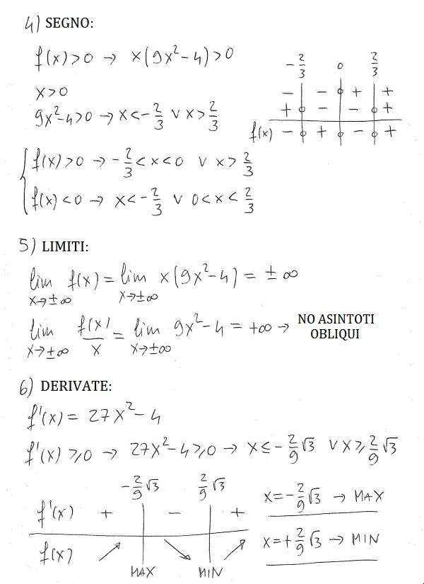 ciao Alberto, innanzitutto grazie per l’aiuto. Nella derivata prima quando pongo >=0 il risultato è x^2>=radice 4/27 quindi x>= +-2/3radice di 3 (non 2/9 radice di 3). Buona giornata :-)